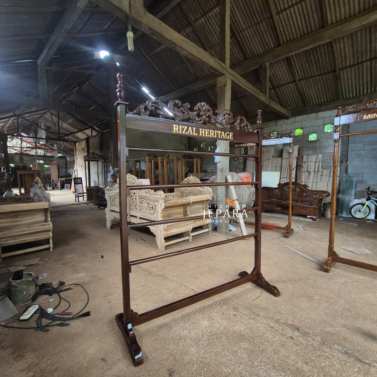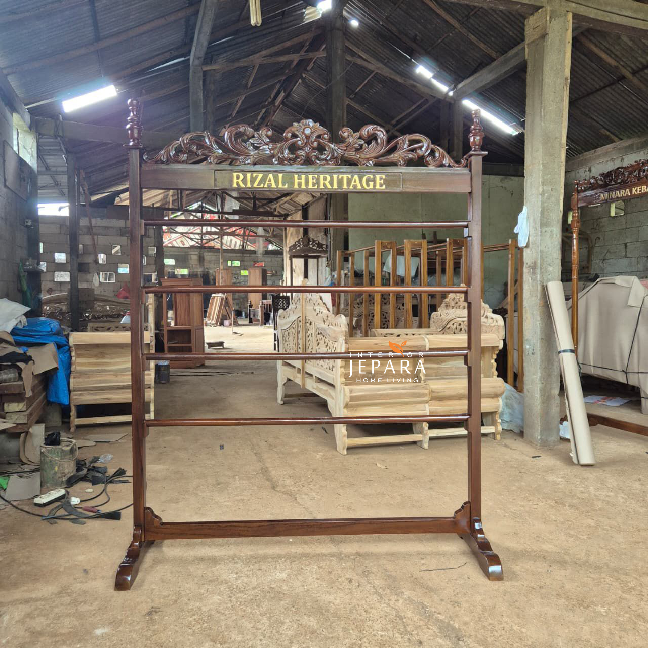 Gawangan Gantungan Kain Batik Ukiran adalah gantungan kain premium berbahan kayu jati solid dengan sentuhan ukiran klasik khas Jepara pada bagian atas. Dirancang kokoh dan elegan, gawangan ini tidak hanya berfungsi sebagai media display kain, tetapi juga menjadi elemen dekoratif bernilai seni tinggi. Dengan desain berdiri dan beberapa palang gantungan, produk ini sangat ideal untuk menampilkan batik tulis, batik cap, kain tradisional, kain tenun, hingga tekstil premium. Cocok digunakan untuk toko batik, butik kain, showroom, galeri, hingga pameran yang ingin menampilkan kesan eksklusif dan berkelas.