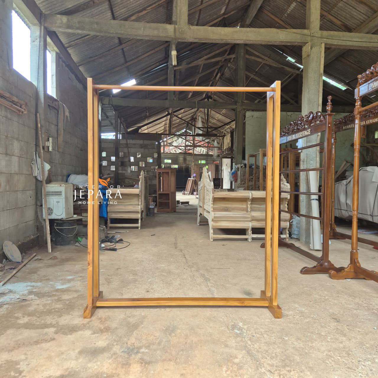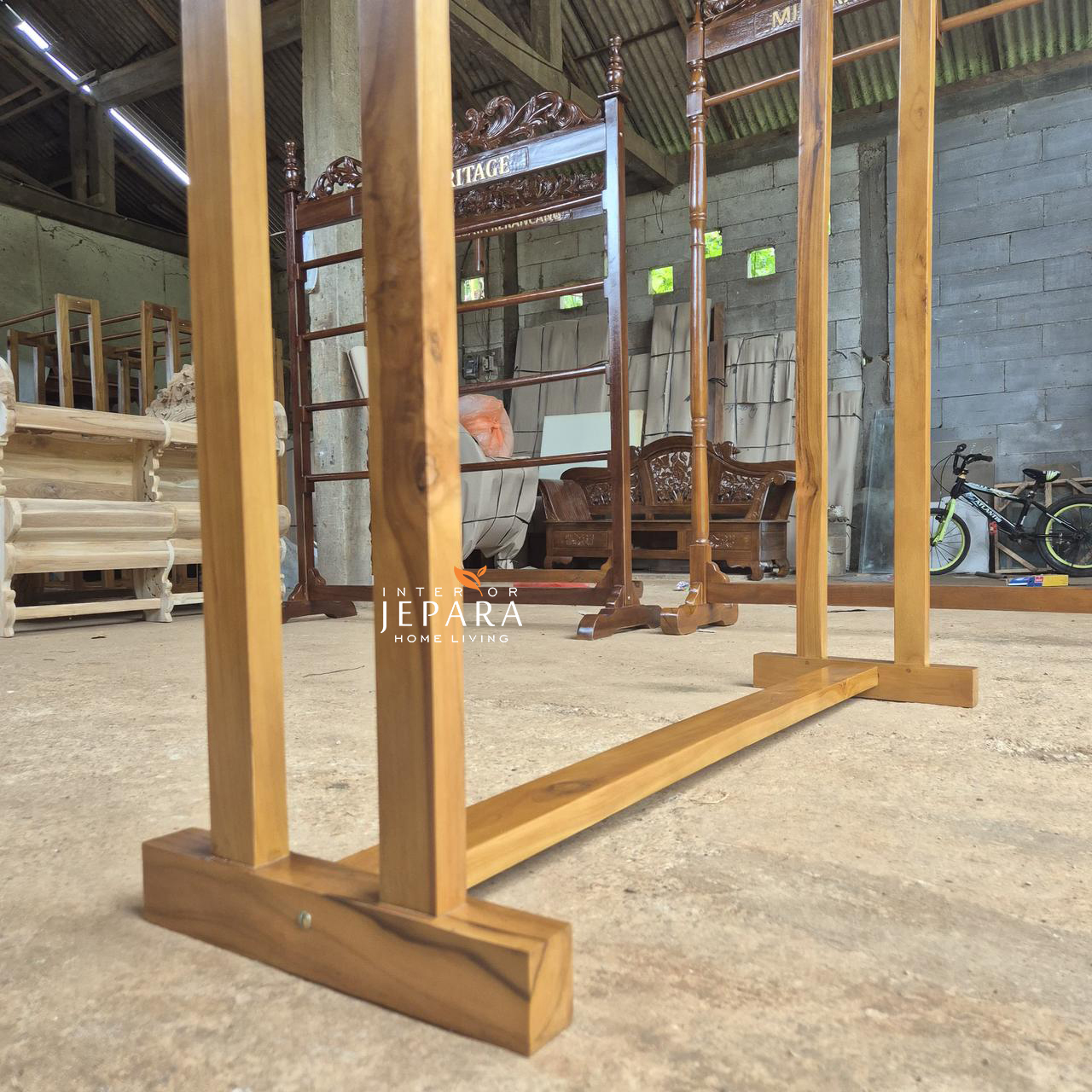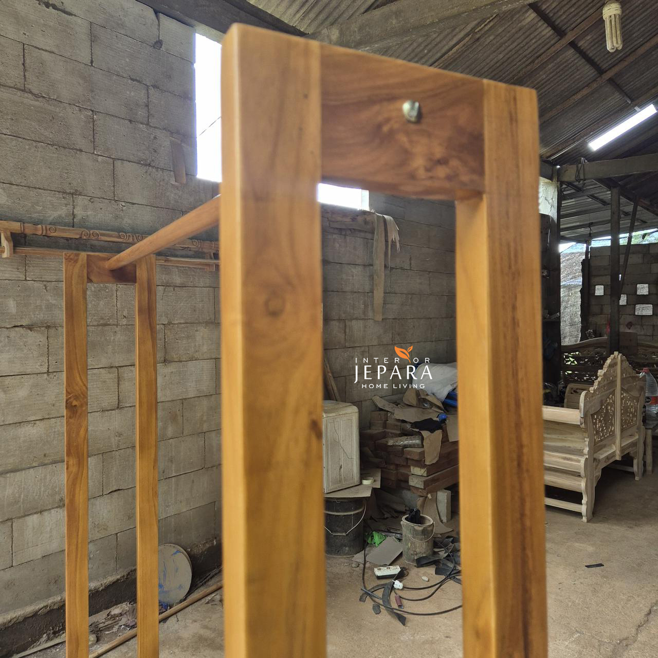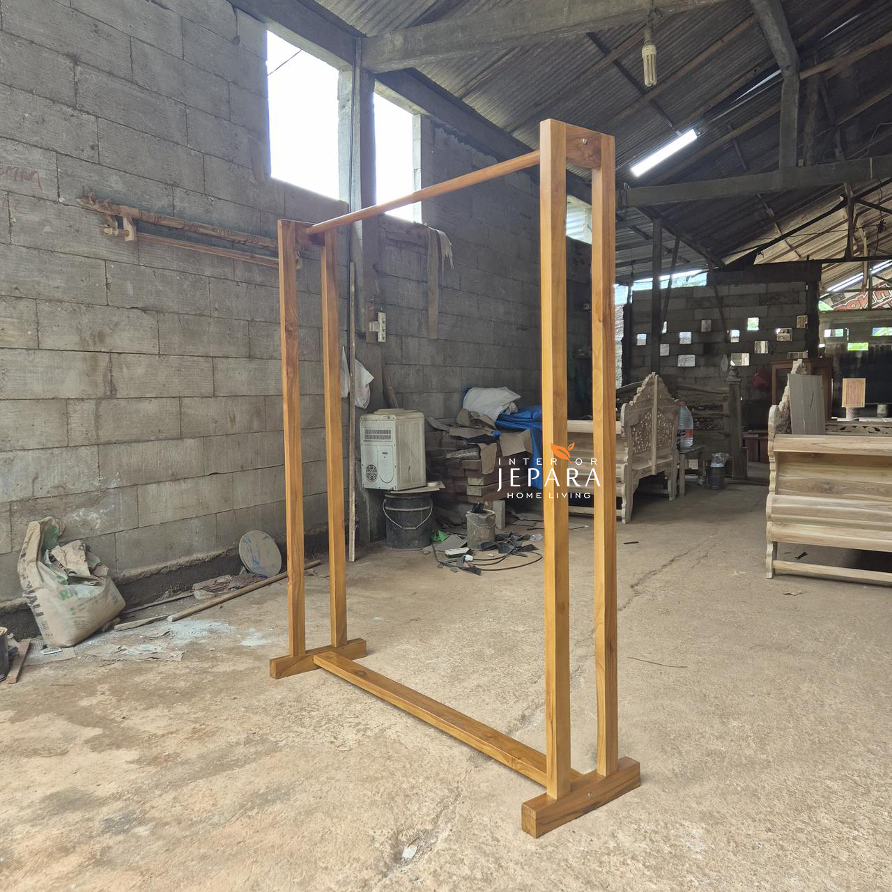 Gawangan kain minimalis dari kayu jati solid. Cocok untuk gantungan batik, toko kain, butik, dan showroom. Kuat, elegan, dan tahan lama.