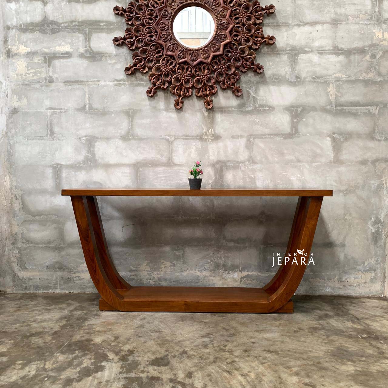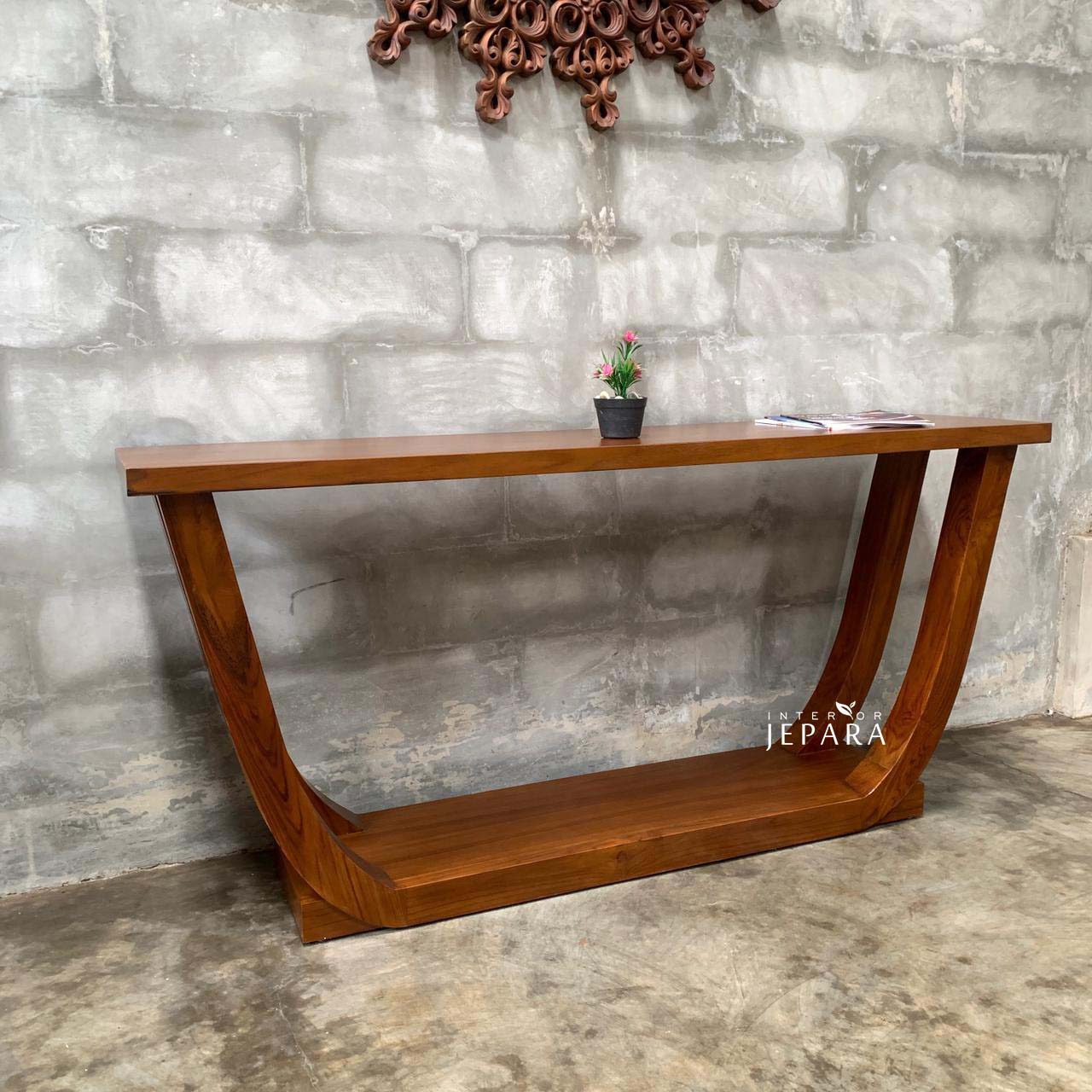 Meja Konsol Minimalis Kayu Jati desain modern lengkung U, kokoh dan elegan. Cocok untuk ruang tamu, foyer, dan dekorasi interior.