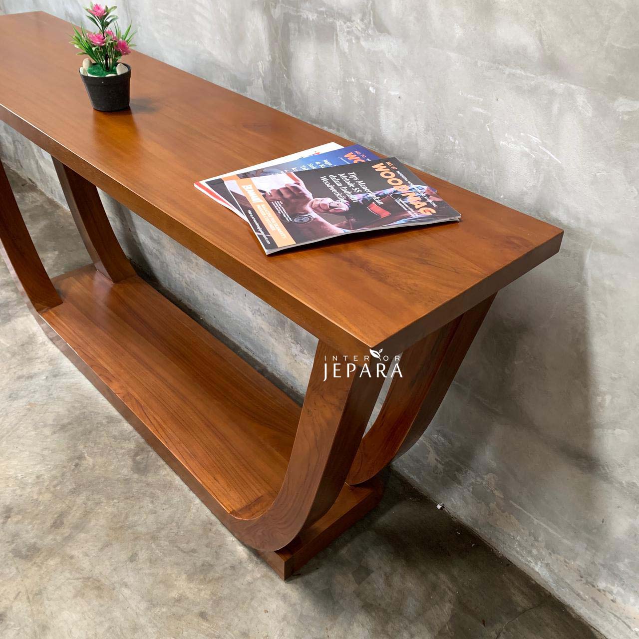 Hadirkan sentuhan elegan dan modern ke dalam ruangan Anda dengan Meja Konsol Minimalis Kayu Jati desain unik berbentuk lengkung U yang kokoh dan artistik. Dibuat dari kayu jati pilihan khas Jepara, meja ini memadukan kekuatan konstruksi dengan tampilan estetis yang mewah dan hangat.