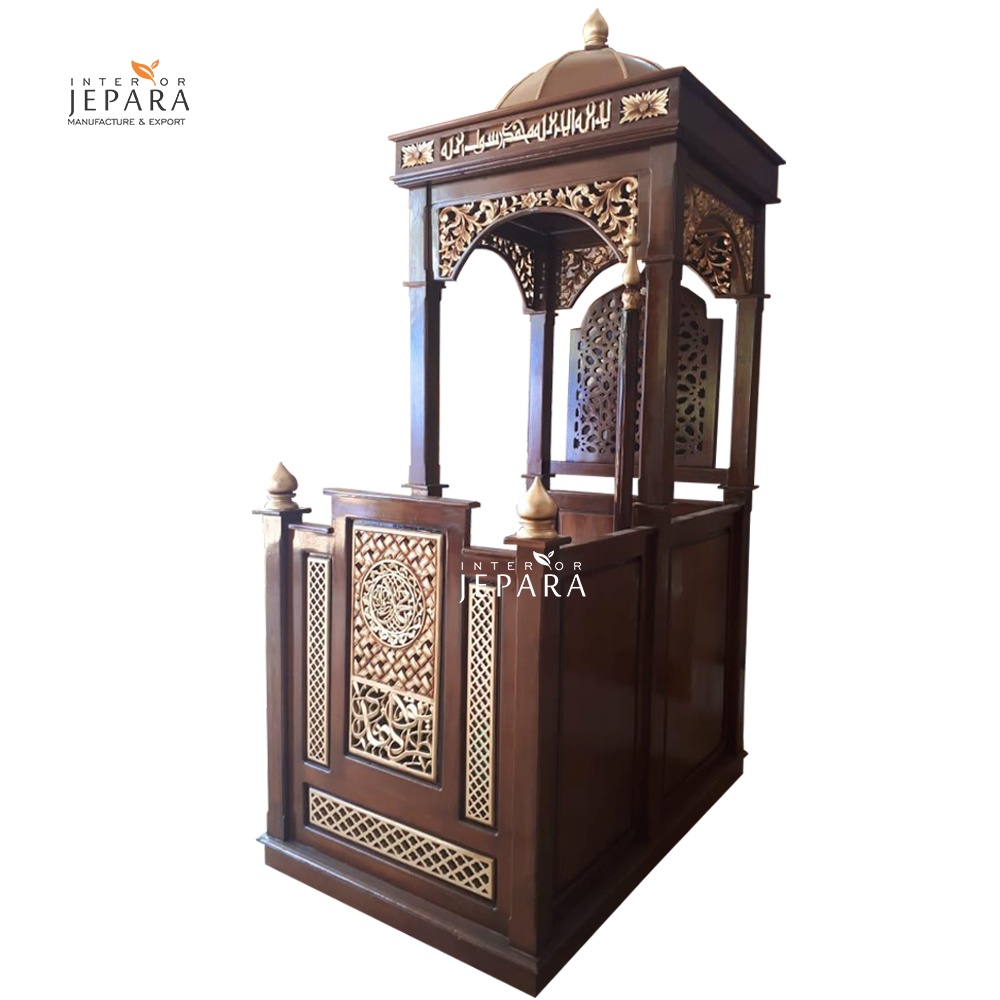 Mimbar Masjid Kayu Jati Ukiran Jepara – Mimbar kubah klasik dengan ukiran kaligrafi elegan, handmade dari kayu jati solid.