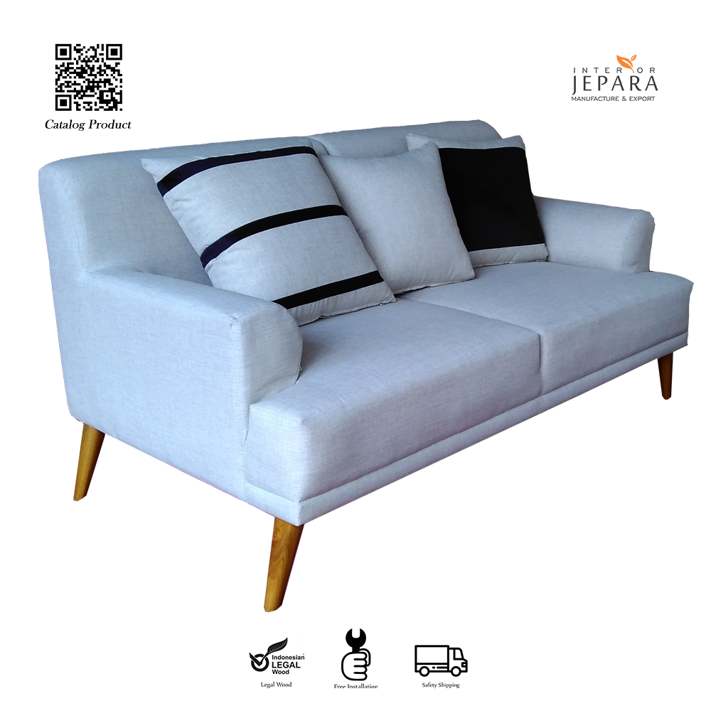 Sofa minimalis modern 2 dudukan dengan desain elegan dan nyaman, cocok untuk ruang tamu, ruang keluarga, maupun apartemen. Dibuat oleh pengrajin Interior Jepara dengan rangka kayu jati kuat, bantalan empuk, dan finishing rapi. Warna abu-abu netral mudah dipadukan dengan berbagai konsep interior modern.